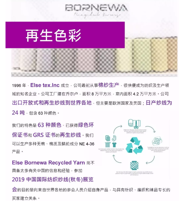 2019秋冬纱线展上,来自土耳其的Else tex.Inc公司将推出63色环保再生纱线,我们拭目以待! 作为亚洲地区最具影响力,涵盖产品面最广、种类最齐全的纤维纱线专业化、国际化、时尚化商贸、展示平台,本届秋冬纱线展将更加多层次、全方位地满足专业观众的需求。 同时,涵盖纺织行业全产业链的"四展联动"也将不仅带来一站式采购便利和上下游产业的产品、技术融合,更会呈现一场包括纤维纱线、面料、服装、针织在内的科技、绿色、时尚大纺织精彩视觉盛宴。