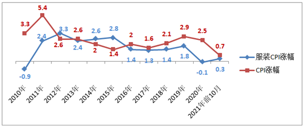 数据来源:国家统计局 2.服装消费价格温和上涨 服装消费市场活跃度提升,同期价格涨幅回落,使得今年服装消费价格实现温和上涨。但由于居民消费心理依然偏谨慎,企业在疫情影响下库存水平有所提升,使得服装消费价格难以从整体上实现大幅度增长。2021年前10月,服装消费价格累计上涨0.3%,涨幅虽然较2020年有所回升,但低于居民消费价格涨幅0.4个百分点。 图表2:2010-2021年前10月服装类居民消费价格涨幅(%)