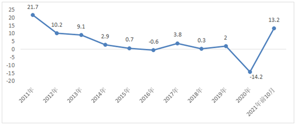 数据来源:国家统计局 图表5:2011-2021年前10月全国重点大型零售企业零售额增速(%)
