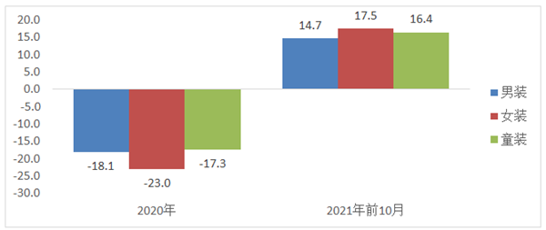 数据来源:中华全国商业信息中心 图表7:2020年、2021年前10月全国重点大型零售企业男装、女装、童装零售额增速(%)