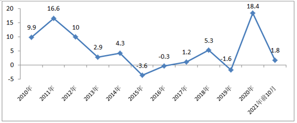 数据来源:中华全国商业信息中心 4.全国重点大型零售企业服装消费均价持续提升 2021年前10月,全国重点大型零售企业服装消费均价在上年增长18.4%的基础上,实现1.8%的同比正增长,反映大型零售企业服装消费持续升级,品质消费、品牌消费特征明显。 图表8:2010-2021年前10月全国重点大型零售企业服装消费均价涨幅(%)