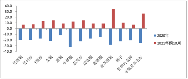 数据来源:中华全国商业信息中心 图表10:2020年、2021年前10月全国重点大型零售企业各品类服装零售量同比增速(%)