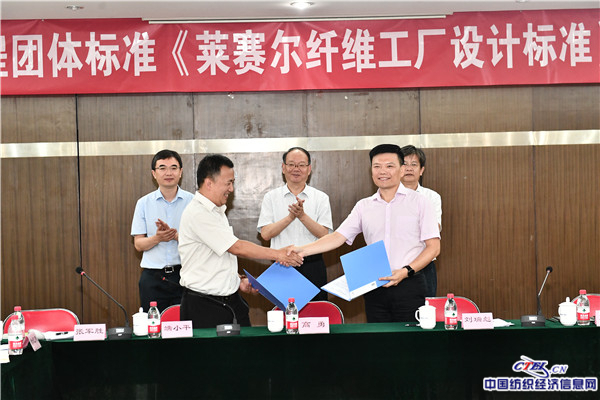 在行业领导与业内专家的共同见证下,张军胜代表中国纺织工业联合会,刘剑代表中国纺织科学研究院有限公司,双方签署了纺织工程团体标准《莱赛尔纤维工厂设计标准》编写框架协议。随后,张军胜宣读了编委会名单,高勇任编委会主任、中国纺织科学研究院有限公司董事长庄小雄任编委会副主任,并向编委会成员颁发了纺织工程团体标准《莱赛尔纤维工厂设计标准》编委会证书。