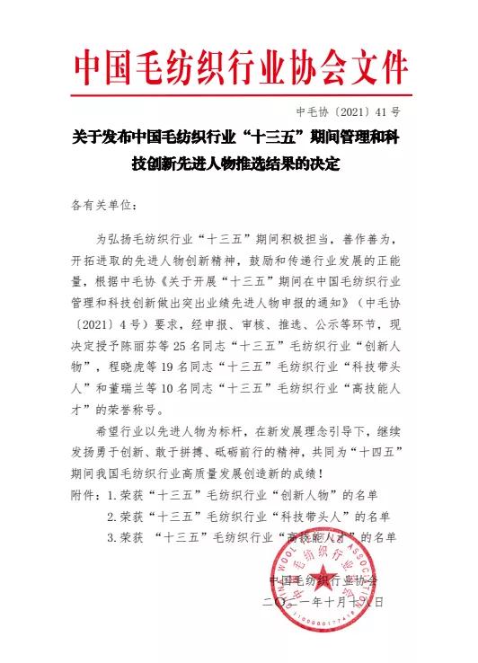CTEI网讯 为弘扬毛纺织行业“十三五”期间积极担当,善作善为,开拓进取的先进人物创新精神,鼓励和传递行业发展的正能量,今年以来,中国毛纺织行业行业协会开展“十三五”毛纺织行业“创新人物”等评选。经过申报、审核、推选、公示等环节,今天中国毛纺织行业协会正式公布相关评选活动。 其中,大朗镇毛纺织行业管理委员会主任、资产经营公司总经理陈柱权获评“十三五”毛纺织行业“创新人物”。 01 勇者本色、智者底蕴