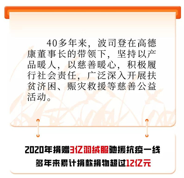 近日,突如其来的洪灾及风雨寒潮导致山西多地受灾,山西的灾情也牵动着全国人民的心,波司登公益基金会再次携手中华慈善总会紧急驰援山西,向山西省捐赠500万元善款和价值4500万元的高品质防寒服,用于灾后重建及救灾人员、受灾群众御寒保暖,共同助力山西抗洪救灾和灾后重建工作。