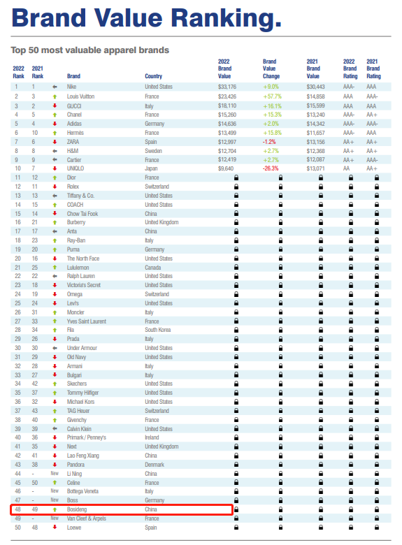 品质卓越 波司登专注羽绒服46年,已经成为国人心目中的“羽绒服”代名词和全球超2亿人信赖的专业品牌,市场占有率常年稳居第一。波司登坚持品质为本、深耕技术创新,为羽绒服注入时尚因子和科技元素,领跑行业的功能性与时尚感,助力波司登在中高端羽绒服装市场一枝独秀。在Brand Finance 2022全球最具价值服饰品牌排行榜上,波司登入列 50 强。
