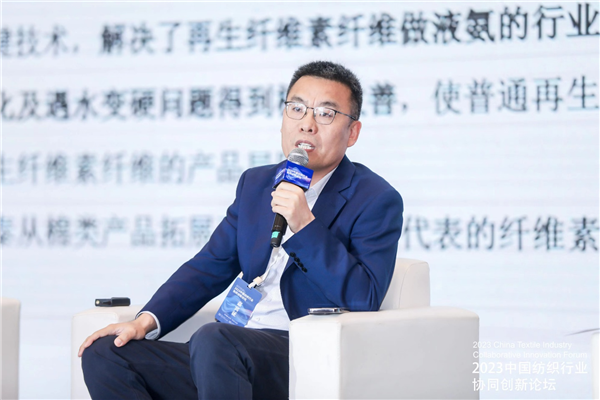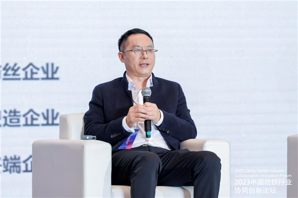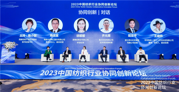 协同创新对话环节由国家纺织产品开发基地秘书处秘书长陈小丽主持,福建永荣锦江股份有限公司(国家功能性聚酰胺纤维产品开发基地)高级合伙人/副总经理陈信富、康赛妮集团有限公司(国家羊绒和花式纱线产品开发基地)研发经理徐媛媛、鲁丰织染有限公司(国家印染免烫面料产品开发基地)技术研发部经理齐元章、浙江传化化学集团有限公司(传化智联股份有限公司|国家纺织化学品开发基地)总裁屈亚平、年年有余(浙江)文化科技有限公司(国家新汉服产品研发基地)董事/合伙人/副总经理王建帅,共同就产业链、供应链上下游的协同创新展开了热烈探讨。