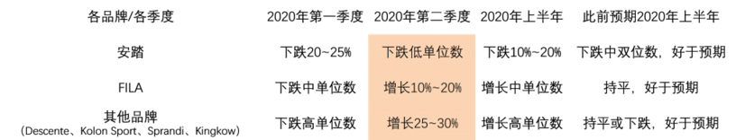 2020年7月15日,安踏公告2020年第二季度及上半年营运表现、中期业绩预告以及迪桑特中国重组事项。 公司二季度销售回暖,FILA恢复正增长 公司预计2020上半年销售持平或下跌不多于5%,归属于母公司净利润同比下跌不超过25%(未计Amer合营公司亏损)。旗下加拿大户外品牌始祖鸟的母公司Amer Sports销售受2020年第一季度暖冬及海外疫情等影响,若包括Amer合营公司亏损,归属于母公司净利润同比下跌不超过35%。 安踏品牌及FILA品牌业务的毛利率均略为下降是造成净利润下跌的一个因素 安踏主要采用批发模式,在2020年上半年,公司回购了约15%的产品,该部分产品通过电商、奥特莱斯二次销售,产品毛利率相对偏低; FILA主要采用直接零售模式,促销清货活动导致零售折扣增加。 此外,公司还主动给分销商在应收账款方面给予更多弹性,整体员工成本上升也对公司盈利造成影响。 从各品牌销售来看,公司二季度销售明显回暖,各品牌均取得了好于预期的零售表现,增长相比第一季度提速。其中值得关注的是,FILA(斐乐)品牌恢复正增长,Descente (迪桑特)实现60%+的增长。