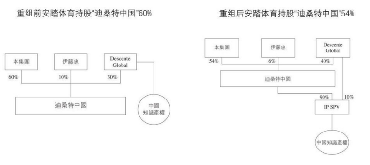 迪桑特中国重组,注入知识产权 根据安踏公布附属公司迪桑特中国控股有限公司信息,迪桑特中国是一家合营公司,目前安踏体育集团拥有其60%股权、Descente Ltd.的全资附属公司Descente Global拥有30%股权、伊藤忠商事株式会社的全资附属公司伊藤忠拥有10%股权。迪桑特中国控有在中国大陆、香港及澳门经营迪桑特品牌业务的实体。 根据迪桑特中国重组事项,迪桑特将中国知识产权注入新成立实体(“IP SPV”),该实体由Descente Global全资拥有,并由Descente Global向迪桑特中国注入IP SPV 90%权益及增加Descente Global于迪桑特中国的股权。 此前,迪桑特的商标没有被纳入合营公司,所以每年要给迪桑特商标使用费。随着迪桑特本身的股权结构发生变化,现在新的董事会更加重视中国业务。 2019年迪桑特中国在大陆经营136家零售店,零售额接近10亿元,并且实现盈利。安踏董事局主席兼CEO丁世忠多次提到,细分市场是安踏未来赶超国际巨头的机会,迪桑特则在高端和冬季运动领域扩张市场。