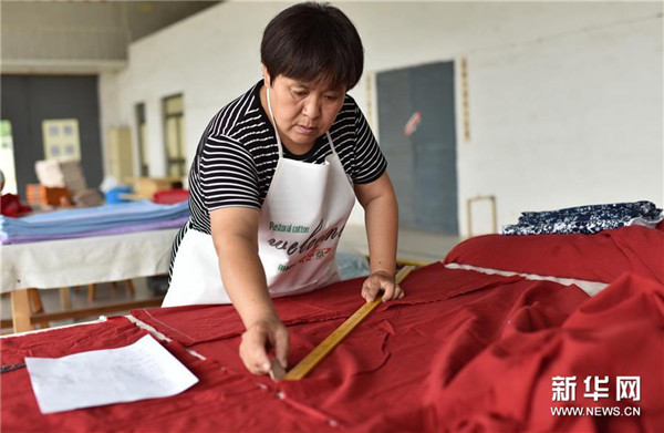 6月22日,工人在衡水市冀州田园棉文化园生产车间裁剪老粗布。 近年来,河北省衡水市冀州区依托当地传统非遗项目——田园棉手织粗布技艺资源,采取“非遗+扶贫”的文化扶贫模式,扶持开设手工老粗布产业作坊,让农户在家门口实现就业,推进传统手工艺的传承和产业振兴,带动群众增收致富。