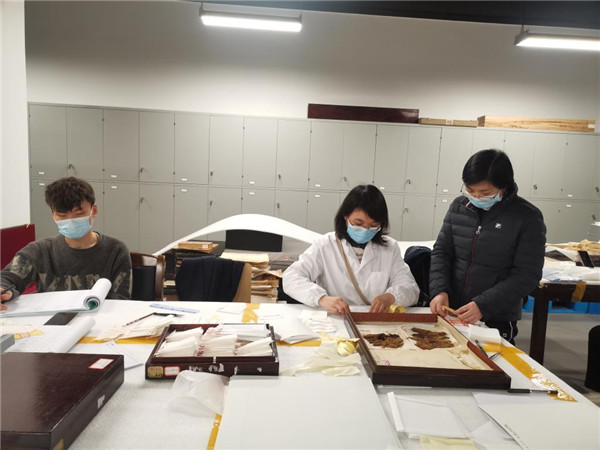 这是喻燕姣(右)正在指导工作人员对马王堆汉墓出土的文物进行清库建档。湖南省博物馆供图 长期从事古代纺织品文物保护修复与研究的湖南省博物馆副研究馆员董鲜艳说,由于早前出土的丝织品数量大,破碎成块的残片以及大堆纺织品粘连堆积成的“丝砖”等都未定级入账,仅作为资料文物保存入库。此次清库,专家将有信息量、有一定特色和意义的残片都进行了归档。 “清库是为了更好地保护和保管文物。”湖南省博物馆马王堆汉墓及藏品研究展示中心主任喻燕姣说,清库时在菱纹绮残片里发现了文字。“这是首次发现马王堆汉墓出土的菱纹绮里有织入的文字,是典型的篆隶,体现了汉初高超的纺织品织造技艺。”
