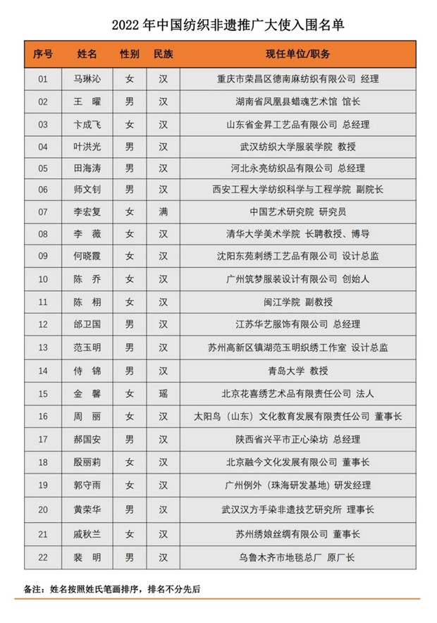 中国纺织非遗推广大使推选作为中国纺联非遗工作的一项年度活动,得到了社会各界的广泛参与关注。为深化推进中国传统工艺振兴和推动传统工艺高质量传承发展,建设纺织非遗高素质人才队伍,以榜样力量持续引导社会有关人士参与到非遗保护与传承工作中来,中国纺织工业联合会非物质文化遗产办公室于2022年7月启动年度中国纺织非遗推广大使推选活动。 经过近两个月的全面征集推选和严格初评,来自12个省、市、自治区的22位入围名单已确定。按照推选程序,现通过中国纺织工业联合会官方媒体及《中国纺织非遗》微信公众号面向社会公示入围姓名、职务(称)及个人主要业绩、工作成果,公示期间无任何不良反馈将进入候选人资格。公示时间为2022年8月30日至9月2日,最终入选结果将在第六届中国纺织非物质文化遗产大会上揭晓。 特别提示:中国纺织非遗推广大使推选活动一直以公开、公正、公平、公益为基本原则,全程不向参与活动的单位及个人收取任何费用。公示期间,如对入围者姓名、职务(称)、个人事迹、业绩成果、品德行为存在异议,请发送邮件至组委会反映,监督邮箱:fzfy2017@163.com,组委会拥有最终解释权。
