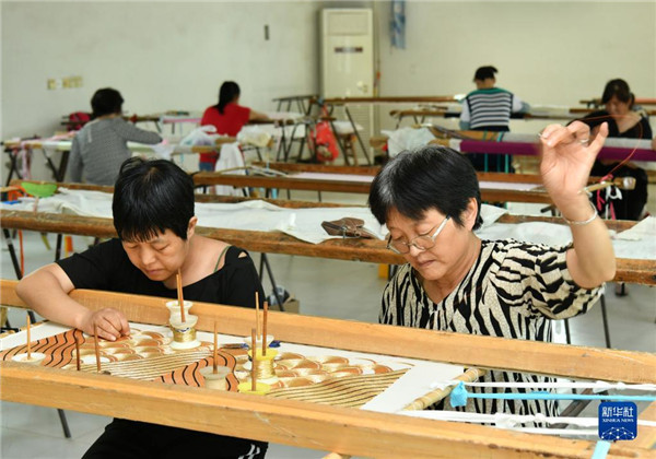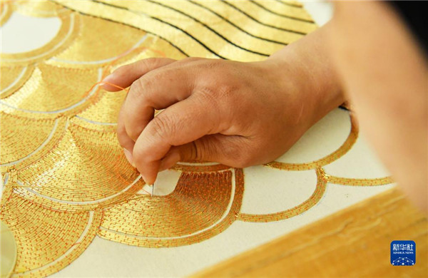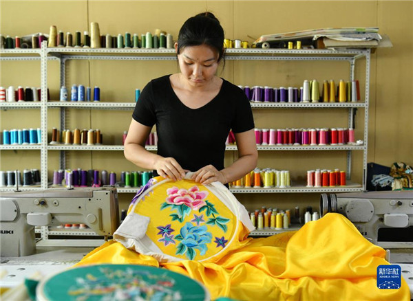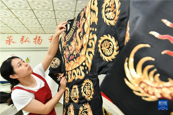 6月13日,河北省肃宁县邵庄乡东高家口村一家戏曲服装厂的工人在绣制戏曲服装。 河北省肃宁县邵庄乡东高家口村的戏曲服装服饰制作技艺至今已传承百余年,2017年被列入沧州市市级非物质文化遗产名录。近年来,当地在推进产业富民的过程中,积极推进传统技艺与现代工业生产有机融合,成立、引进服装加工企业,为100多名当地留守妇女提供就业岗位,在促进居民增收的同时,推动了传统非遗的传承。(新华社记者 牟宇 摄)