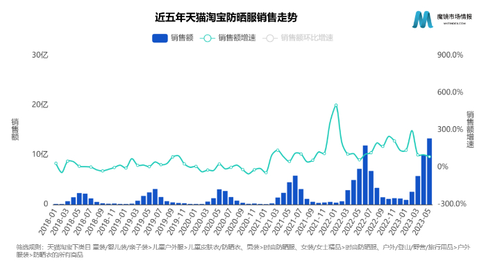 热辣的阳光炙烤着大地,街上来往的行人都将自己“捂”得严严实实,用各种各样的形式开启最强“防晒模式”。高温、阳光、出行等一系列要素加快了防晒服市场的发展。 国内防晒市场“朝气蓬勃” 防晒似乎一直是夏季的重要关联词之一。随着消费者的防晒意识不断增强,防晒市场发展至今仍在持续扩张。除了常见的防晒霜、遮阳伞、遮阳帽外,还有防晒服、防晒口罩、防晒冰袖、防晒腿套、防晒袍等产品都在逐步成为不少消费者的必备防晒单品。这其中防晒服成为了今年备受推荐与关注的防晒装备之一。 从魔镜市场情报监测的数据来看,近五年来,天猫淘宝防晒服市场的规模逐年扩大,销售额和销量都呈现增长趋势,同时商品均价也有所上涨。伴随消费者对皮肤健康和防晒的关注不断增加,防晒服的需求呈现出快速增长的趋势,在服饰市场稳中有升。从此前的销售数据可以看出,防晒服增长潜力十分突出,且功能时尚兼备。我们也可以从品牌动态中看到,波司登、骆驼等品牌均已开始选择拓展布局防晒服市场。防晒服市场的前景可以说十分乐观。