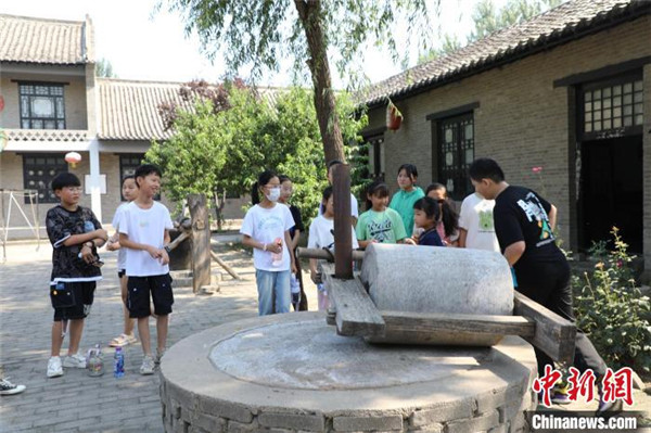 8月15日,孩子们在衡水市冀州区的田园棉文化园内感受手推石磨传统民俗。刘延岭 摄