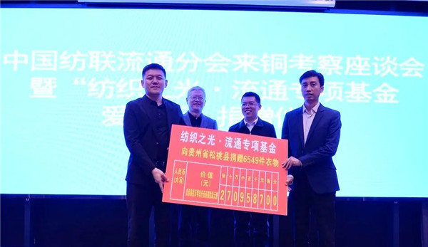 10月26-28日,纺织之光·流通专项基金会组织来自广州、虎门、辽宁西柳、常熟、郑州、重庆、嘉兴、济南以及青岛即墨的15家纺织服装流通领域专业市场、协会赴贵州省铜仁市松桃县开展“纺织之光·流通专项基金爱益行”活动,在保证物资品质的前提下,经过严格筛选,累计捐赠了毛衫、棉服、羽绒服、新疆棉棉被等6500余件物资,为松桃县人民送去温暖,凝聚纺织服装产业的行业力量,展现纺织服装流通领域责任担当。据统计,本次捐赠物资价值超270万元。