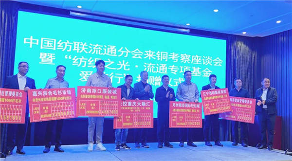 活动期间,中国纺联流通分会来铜考察座谈会暨“纺织之光·流通专项基金爱益行”捐赠仪式在铜仁召开。中国纺织工业联合会秘书长夏令敏,广东省服装服饰行业协会会长、广州红棉国际时装城总经理卜晓强,纺织之光科技教育基金会理事长叶志民,中国纺织工业联合会流通分会副会长徐建华,铜仁市政府副市长范楚平,铜仁市政府党组成员、副秘书长、粤黔协作工作队铜仁工作组组长莫伟鸣,铜仁市政府副秘书长杨渊,松桃县委常委、副县长黄沛民以及纺织服装专业市场、电商协会负责人、铜仁市相关领导嘉宾参加了此次座谈会。