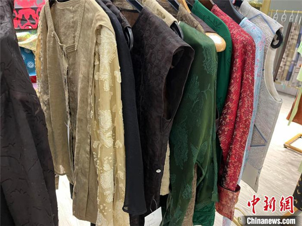 张明强开发的宋锦马面裙面料流光溢彩、灵动素雅。黄彦君 摄 新式宋锦面料笼罩一层珠光,灵动素雅;传统款式以红、黑、蓝为主,金丝线绣出各色纹样,端庄大气……看着熙熙攘攘的客商,海宁中国家纺城董事长殷晓红感受颇深。 外人看到的是一条马面裙,在她看来,这背后是国潮消费的大市场。“马面裙兴起彰显了中国人的文化自信,国潮不仅是一条裙子,正在从方方面面融入生活,我们也在不断开发新产品。”殷晓红指着眼前一款刚刚研发出来的真丝桌旗说。 因文化而兴的国潮服饰,亦需不断增添时代内涵。殷晓红透露,家纺城已和浙江理工大学合作成立了时尚面料创新中心,探索传统面料的时尚化、生活化之路。