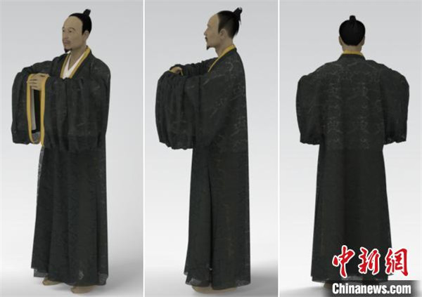 由于服饰文物保存的特殊性,团队无法近距离观察和拍照,唯一能参考的资料便是由黄岩博物馆提供的部分文物图片。此前,该团队采用数字媒体技术和三维图形图像技术,将从赵伯澐墓出土的服饰纹样、织物结构、服装款式、服装穿着状态进行数字化复原,并将服装穿着于虚拟的老年赵伯澐身上。