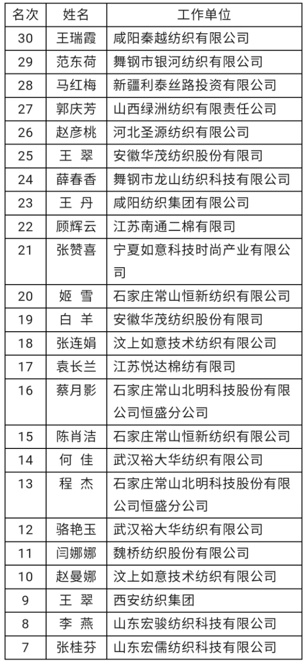 纺织行业职业技能竞赛是技能人才培育的重要平台,推动中国纺织产业的高质量发展,离不开建设和完善一支知识型、技能型、创新型技能人才队伍。 11月22日,为期四天的2024全国行业职业技能竞赛——全国纺织行业“经纬-西纺杯”纺纱工(细纱机操作工)职业技能竞赛全国决赛落下帷幕。经过激烈的角逐,大赛评选出全国前三十强以及“绕皮辊细纱接头”及“顺穿法换粗纱”两个单项的一、二、三名。西安纺织集团汪丽丽获得本次全国决赛第一名!