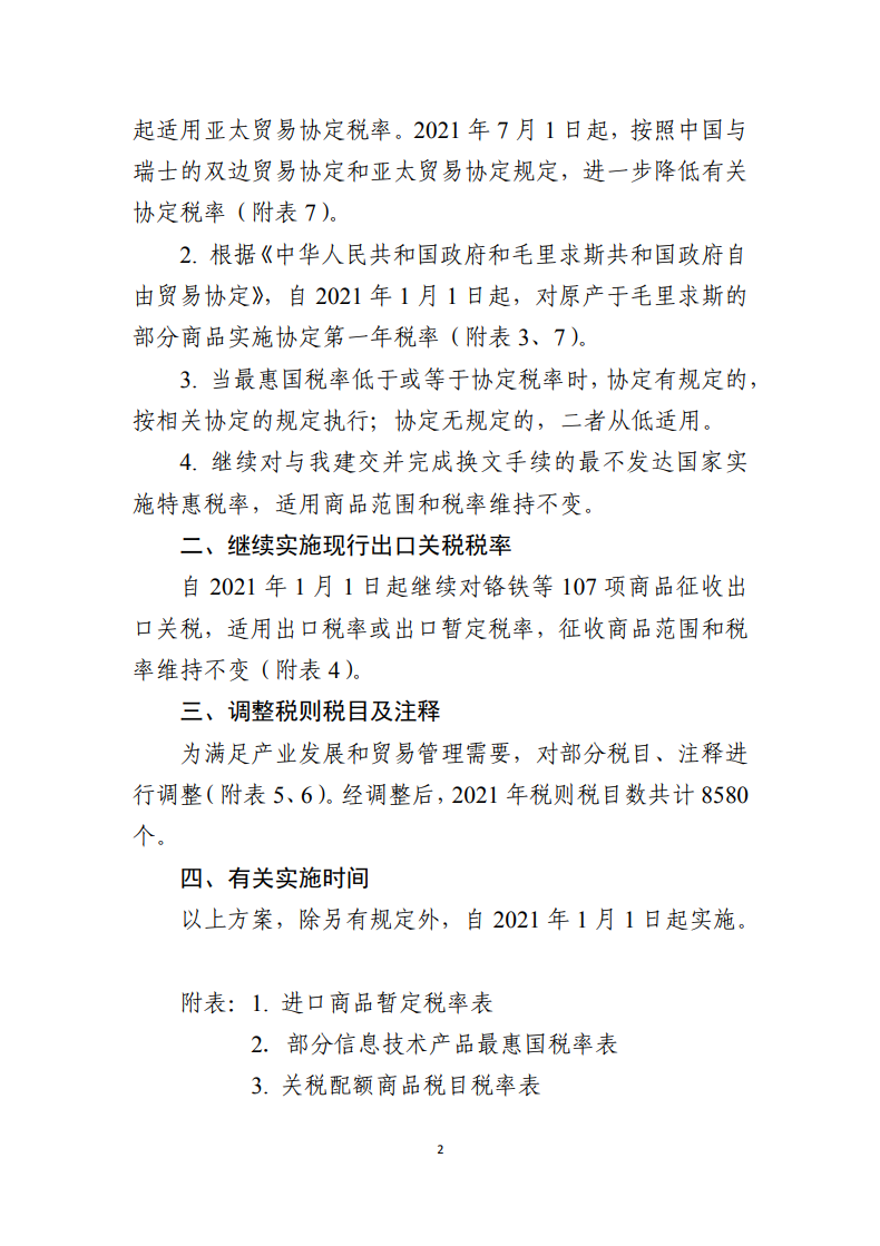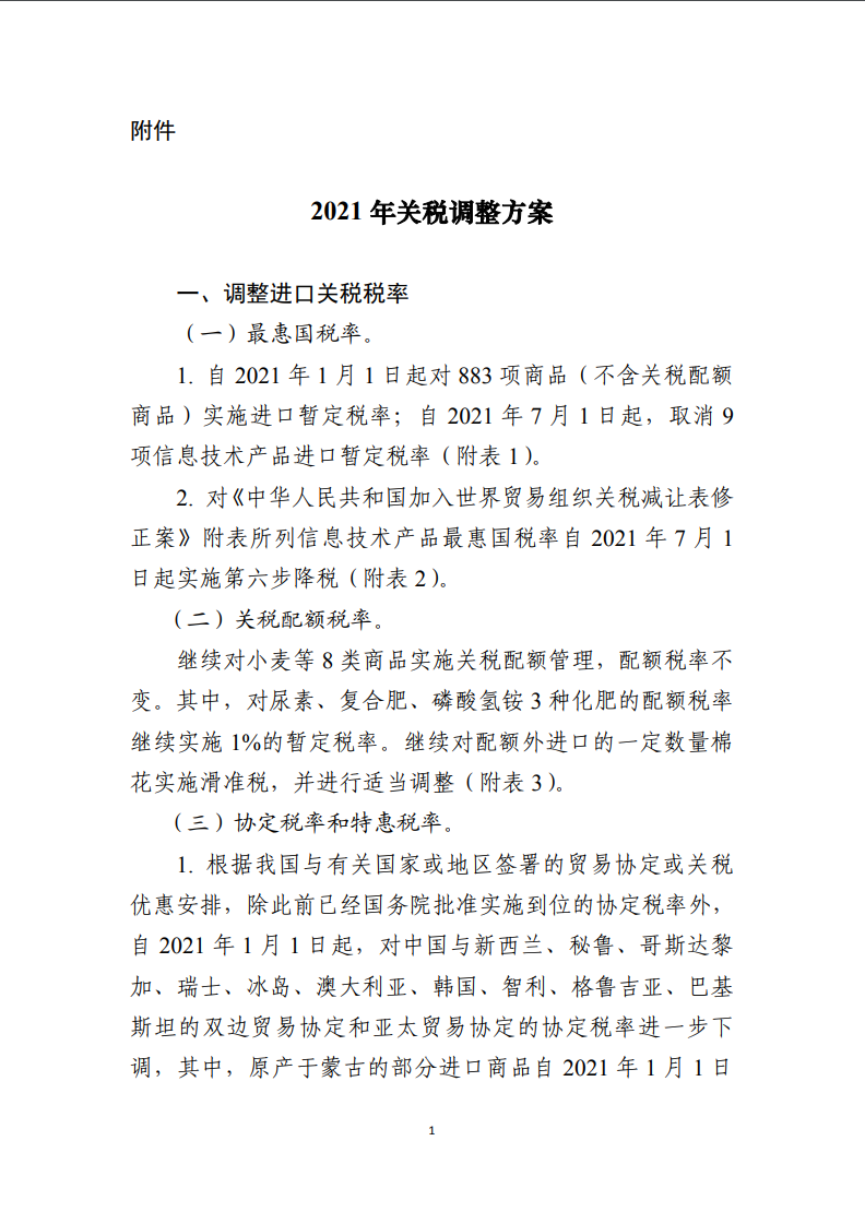 为贯彻落实党的十九届五中全会精神,坚持新发展理念,支持构建以国内大循环为主体、国内国际双循环相互促进的新发展格局,经国务院批准,国务院关税税则委员会近日印发通知,自2021年1月1日起,对部分商品的进口关税进行调整,具体内容见附件。