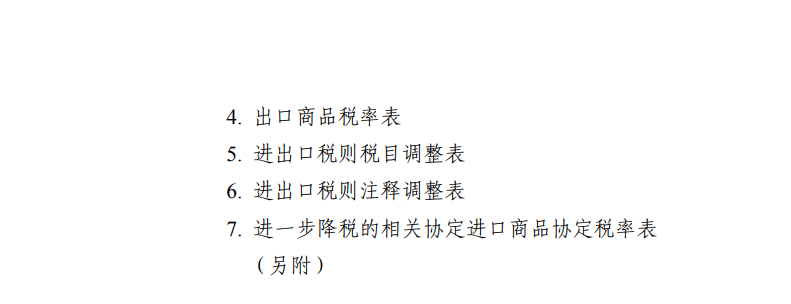 其中附表1"进口商品暂定税率表"中第528-551项涉及纺织品服装;附表2“部分信息技术产品最惠国税率表”中第26项涉及纺织品服装;附表3“关税配额商品税目税率表”中涉及纺织原料羊毛、毛条和棉花;附表7“进一步降税的相关协定进口商品协定税率表”中涉及大部分纺织品服装。
