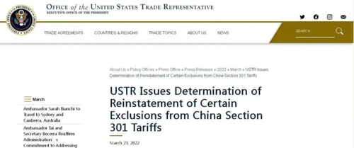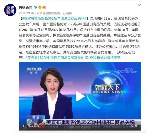 美国贸易代表办公室23日在一份声明中说,继续对其中352项中国输美产品实行豁免,豁免期将回溯至2021年10月12日,直至2022年12月31日。