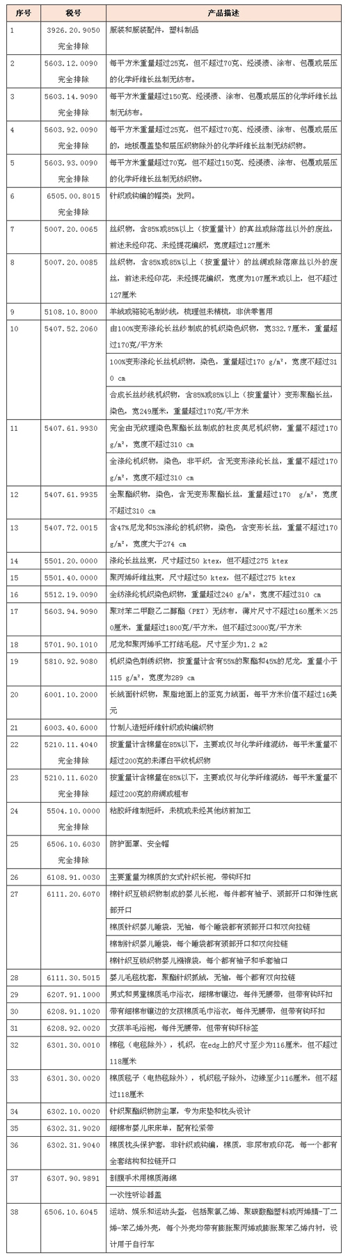 美国贸易代表办公室公布的清单包括泵类产品和电机等工业部件、部分汽车零部件和化学品,以及背包、自行车、吸尘器等消费品。其中涉及纺织服装产品税号38个。此外,此次关税豁免还包括0505.10.0050羽毛、0505.10.0055羽绒和9404.90.1000填充鸭绒或鹅绒的棉质枕头3项产品。有美国专家认为,此次关税豁免证明,中国对有利于美国的全球供应链至关重要。