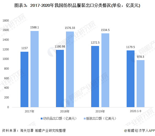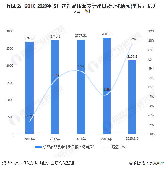 纺织品助行业出口额增长超9% 近五年来我国纺织品服装行业出口整体保持稳定增长,出口额保持在2700亿美元以上水平。2020年前三季度,纺织服装累计出口2157.8亿美元,增长9.3%。