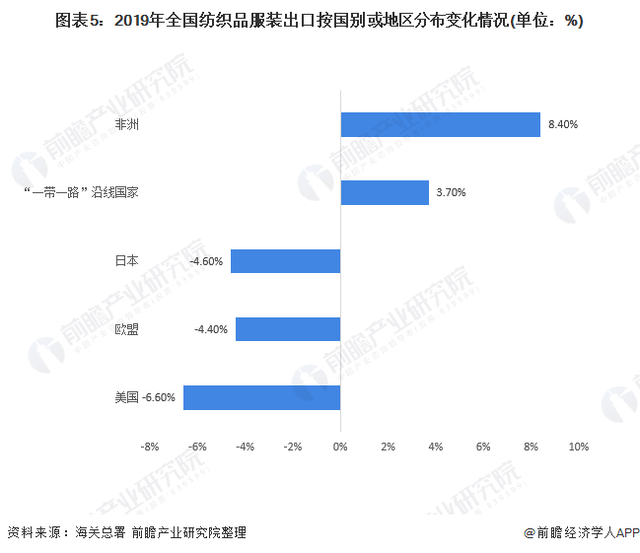 对新兴市场出口积极 从出口市场来看,2019年我国对传统发达国家市场出口规模下降,而对新兴市场出口较为积极。2019年,我国对美国、欧盟、日本出口纺织品服装同比分别下降6.6%、4.4%和4.6%;对“一带一路”沿线国家纺织品服装出口总额增长3.7%;对非洲纺织品服装出口额同比增长8.4%。