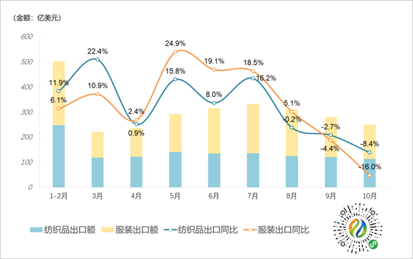 10月当月,我国纺织品服装对全球出口250.2亿美元,同比减少12.7%(以人民币计同比减少6.4%),降幅较上月进一步扩大。其中,纺织品出口113.7亿美元,同比下降8.4%(以人民币计同比减少1.9%);服装出口136.5亿美元,同比下降16.0%(以人民币计同比减少9.9%)。
