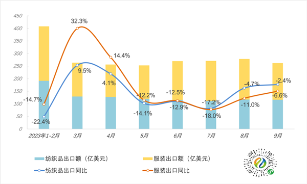 受部分国际品牌库存逐渐消化,新订单需求得以释放等积极因素影响,9月当月,我国纺织品服装对全球出口262.0亿美元,同比下降4.8%(以人民币计同比增长0.8%),降幅进一步收窄3.6个百分点,情况较前几个月明显回暖。其中,纺织品出口116.4亿美元,同比下降2.4%(以人民币计同比增长3.4%);服装出口145.6亿美元,同比下降6.6%(以人民币计同比减少1.1%)。